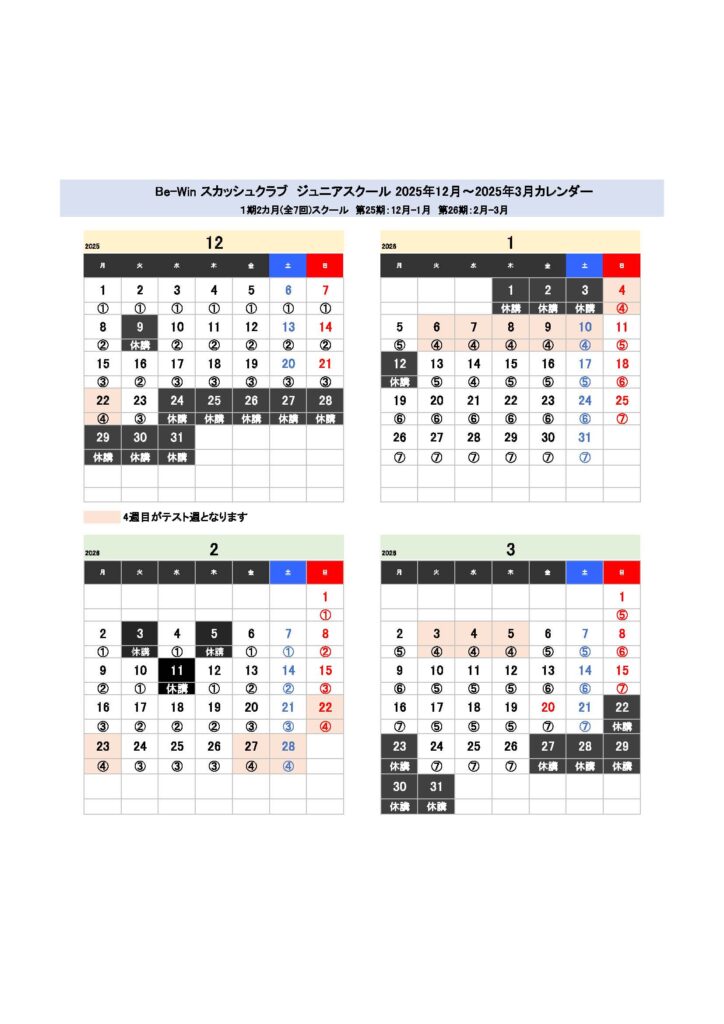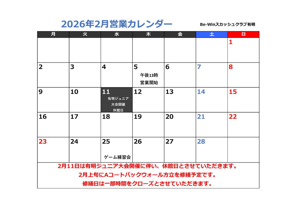2026年2月営業日/ジュニアスクールカレンダーのご案内