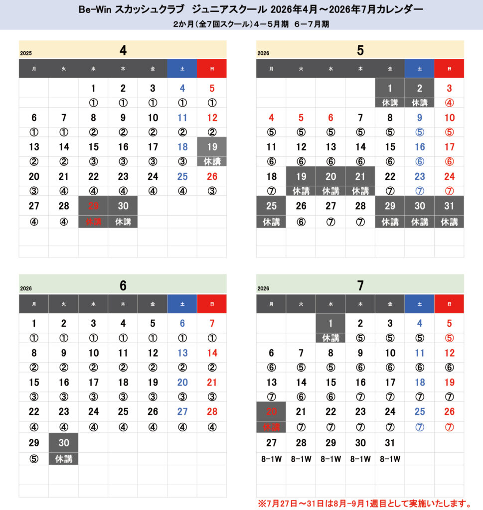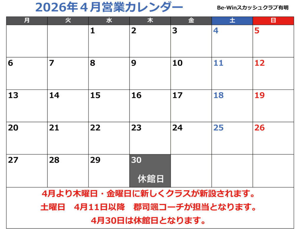 2026年4月営業日/ジュニアスクールカレンダーのご案内